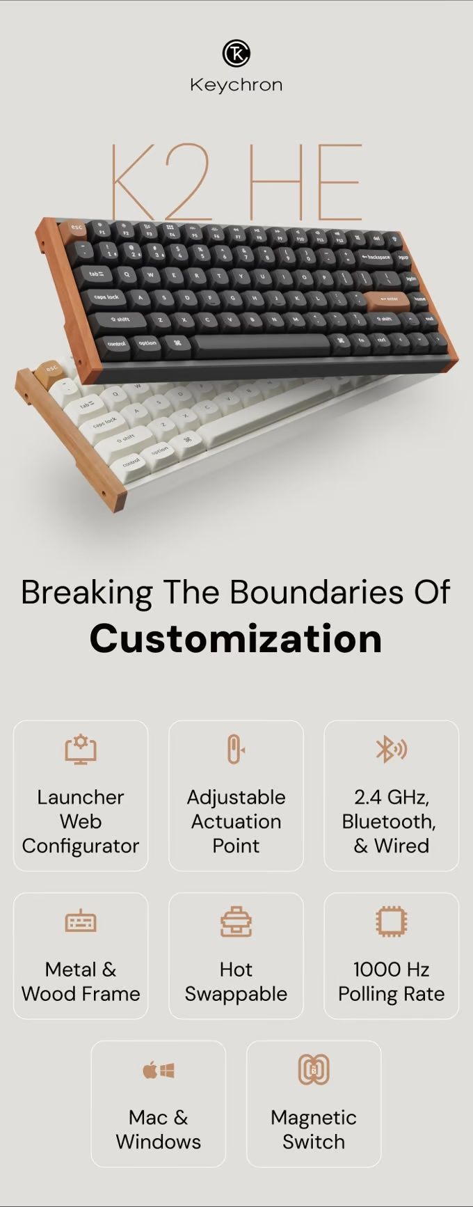 The Keychron K2 HE Mechanical Keyboard on Kickstarter features Hall Effect Magnetic Switches, which allow users to adjust key actuation distance, offering a personalized typing and gaming experience. It supports both wired and wireless connections (Bluetooth 5.1 and 2.4 GHz) and is compatible with Mac, Windows, and Linux. The keyboard boasts a compact design, customizable RGB lighting, and a durable aluminum frame. Its QMK/VIA firmware allows for extensive customization, making it a versatile option for both casual and professional users.